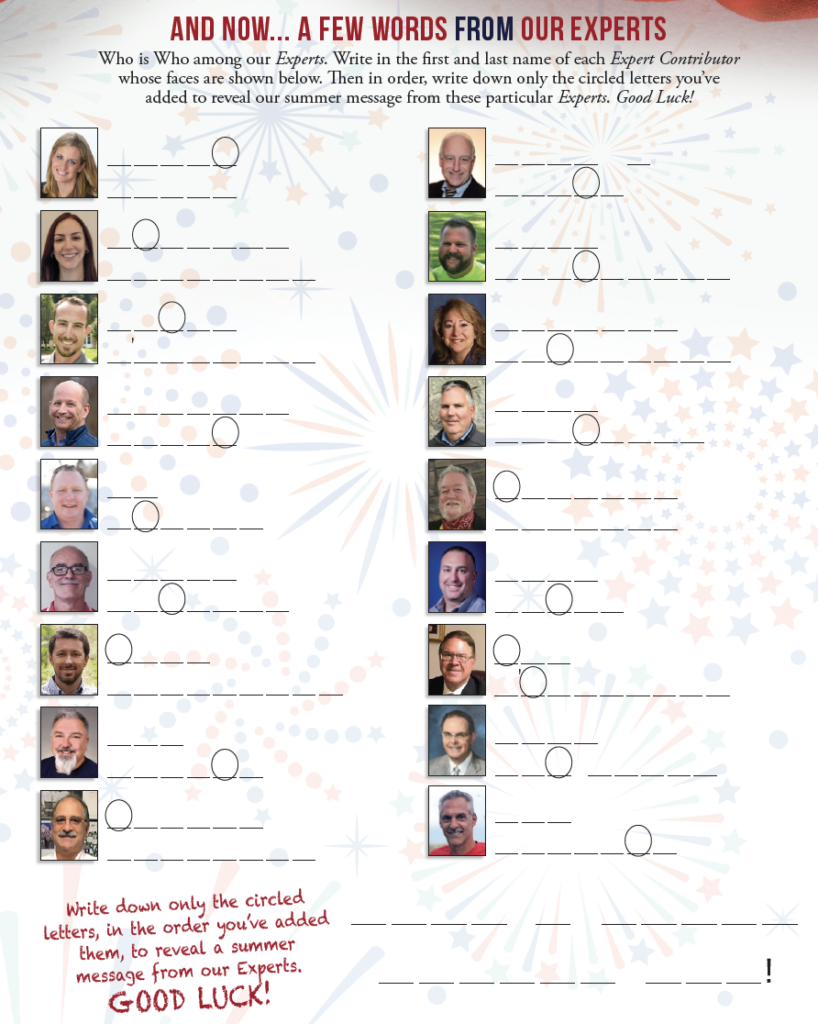 Who is Who among our Experts. Write in the first and last name of each Expert Contributor whose faces are shown below. Then in order, write down only the circled letters you’ve added to reveal our summer message from these particular Experts. Good Luck!