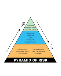 The bottom of the pyramid includes low-risk investments such as government bonds, fixed and indexed annuities, life insurance, CDs and cash savings. These are considered low-risk investments because they have no direct market volatility exposure.