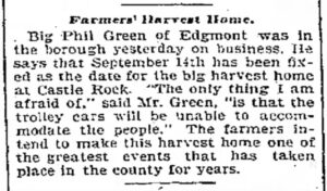 From 1899 to 1904, Edgmont Township’s Castle Rock Park hosted southeastern Pennsylvania’s largest rural gathering: the Tri-County Harvest Home Festival. In its first two years it drew over 10,000 visitors from Delaware, Chester, Montgomery and Philadelphia counties.