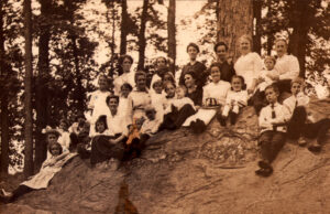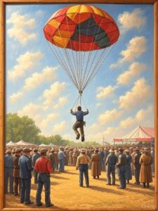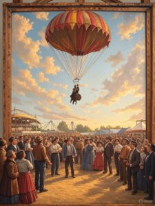 The Park was well-equipped for such gatherings: dance pavilion, shuffleboard, a merry-go-round, athletic contests and live bands set the stage for revelry. Musicians performed throughout the day, and a minstrel troupe added entertainment. Men pitched quoits, children ran races, and hundreds of miniature American flags were released during the patriotic flag-raising ceremony in 1899. A highlight in 1900 was when balloonist B. D. Bowen ascended to 4,000 feet and then jumped out of his balloon –his parachute floating him safely to earth, to the delight of the crowd.