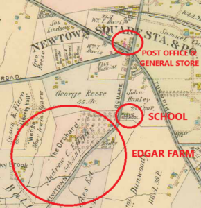 Clinton Phfahler Edgar grew up in Newtown Square, one of seven children of Andrew and Mary Edgar. The family lived on a farm, “The Orchard,” and the farmhouse still exists at 34 ½ Mary Jane Lane, though surrounded by the tract homes built when the farm was sold off in the 1950s. Clinton, known as “Day,” attended local schools. He was 12 in 1907 when the Newtown Square Post Office was burgled for the first time. By 1910, the post office had been robbed four more times, that’s five times in four years! 15-year-old Day Edgar decided that this circumstance was worthy of note, and so he wrote a play about the topic, entitled “Robbing the Newtown Post Office, or Easy Money.” The play was cast, and according to an old history account, “It played to a capacity audience when presented in the old Newtown Hall.”
