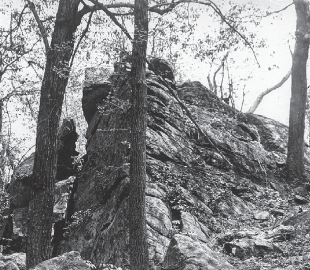 The outcropping, now about 325 feet in elevation, was taller in the past. The trolley company blasted the top of the formation for ballast to use in extending the line to West Chester. When the amusement park closed, a church group continued to hold picnics and religious services at the Rock. WW I veterans began camping there to escape from the city, and erected small camp buildings. A developer bought the land in the 1920’s and began building a model community, by fits and starts as the country entered the Great Depression.