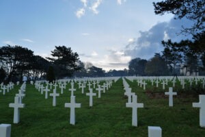 Clifford survived that day. Each day after D-Day, the Allied troops moved forward through a difficult French countryside where each farmer’s field was surrounded by a hedge, giving the defending German troops cover for surprise attacks. The going was slow, and each day, the casualty toll mounted. On June 15th, Clifford and three others were sent in a Jeep to try to make contact with another battalion near La Chapelle. On the return trip, they were strafed by aircraft; two were wounded, and Clifford was killed. He was buried in the cemetery that was hastily created to bury the American and German dead as the invasion swept forward. After the war, these American troops were re-interred in the beautiful Normandy American Cemetery overlooking the beach where Clifford came ashore.